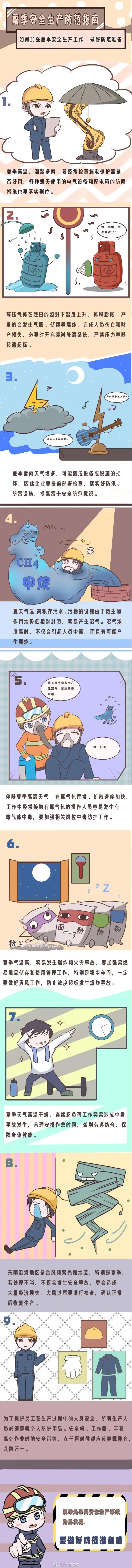 夏季是各類安全生產(chǎn)事故的易發(fā)期,高溫來(lái)襲,加之雷電、暴雨、大風(fēng)等災(zāi)害性天氣也都多發(fā)于此時(shí),給安全生產(chǎn)帶來(lái)很多不利因素,容易導(dǎo)致各類安全事故。一圖了解夏季安全生產(chǎn)防范指南↓↓