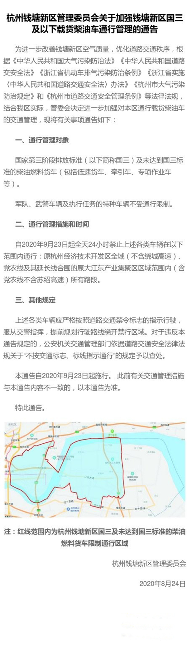 2020年9月23日起,國三及未達(dá)到國三標(biāo)準(zhǔn)的柴油燃料貨車全天24小時禁止在原杭州經(jīng)濟技術(shù)開發(fā)區(qū)全域(不含繞城高速)、黨農(nóng)線及其延長線合圍的原大江東產(chǎn)業(yè)集聚區(qū)區(qū)域范圍內(nèi)(含黨農(nóng)線不含蘇紹高速)所有路段通行,具體詳見: