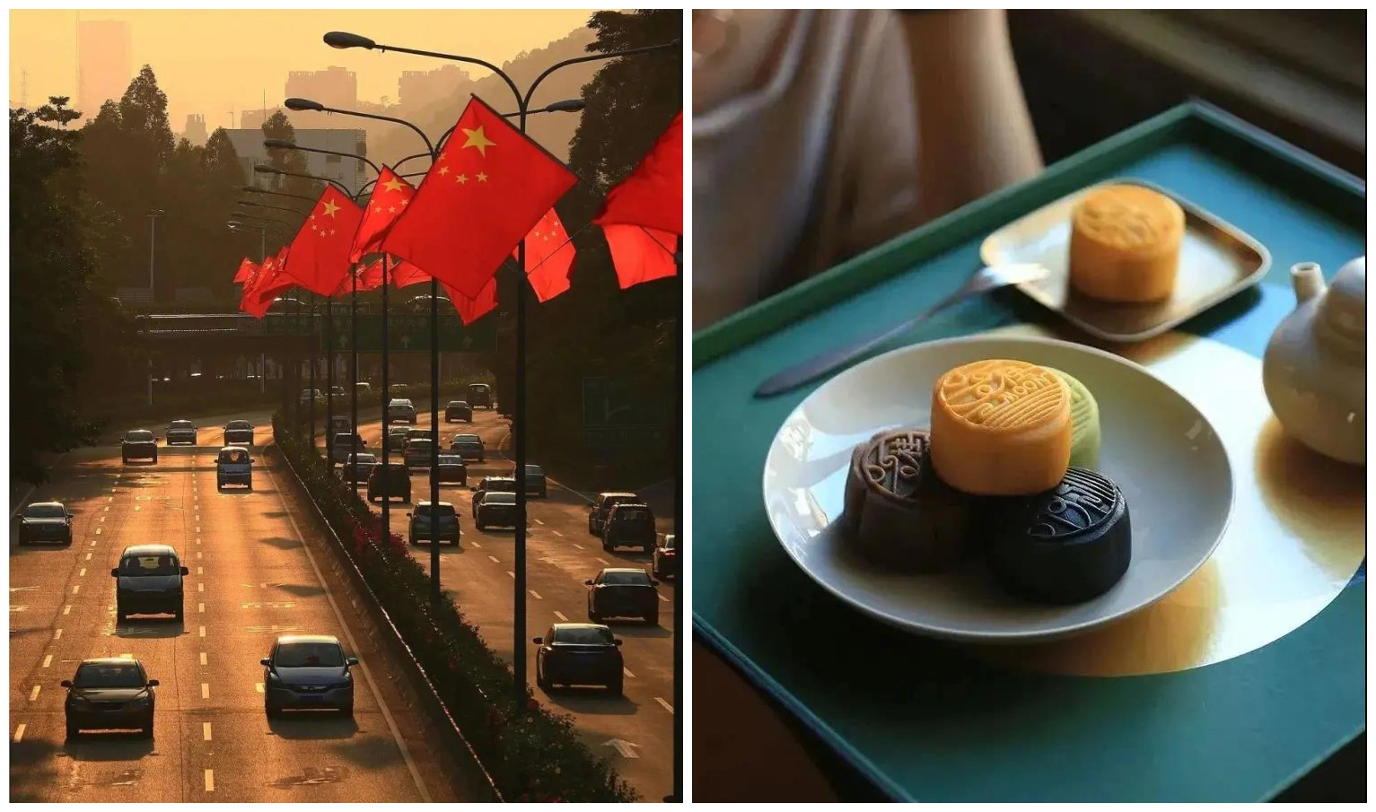 隨風飄揚的五星國旗與滿街飄香的月餅