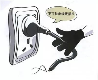 拔插頭時不要拽電源線,這樣容易把電源線與插頭連接的部位拽斷,從而發生短路、漏電,引發火災和觸電事故。