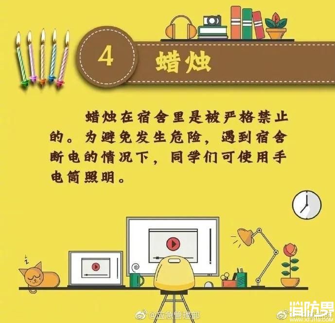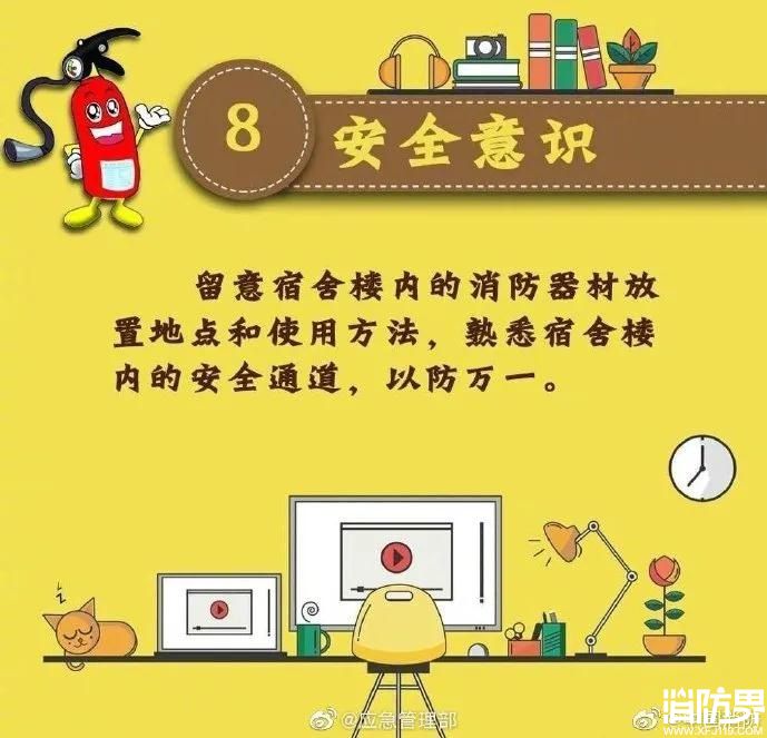 宿舍是人員密集場所,是同學們休息、存放貴重物品和衣物的地方,也是容易麻痹大意、疏于防范的地方。同學們一定要警惕,提高消防安全意識,防患于未“燃”!