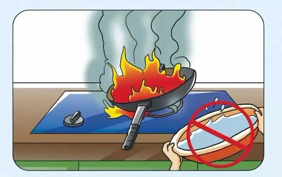 油鍋起火,應(yīng)用滅火毯或鍋蓋蓋上,或倒入青菜,不可用水滅火。