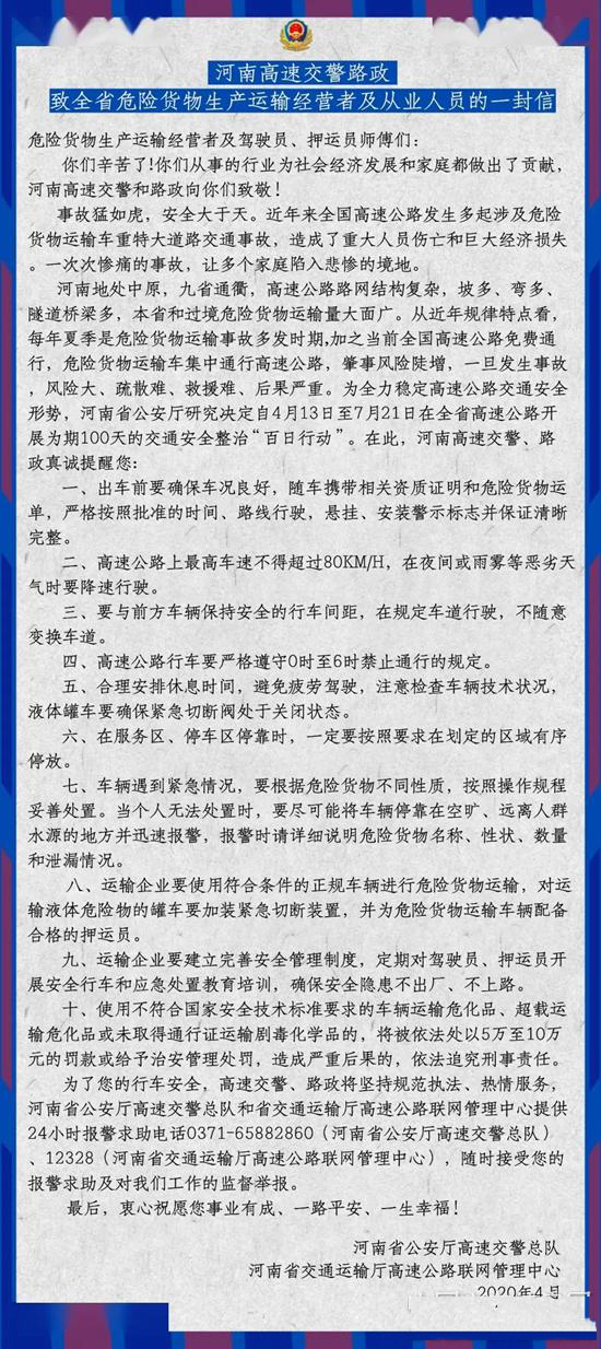 4月16日,河南省公安廳高速交警總隊、省交通運輸廳高速公路聯網管理中心給全省危險貨物生產運輸經營者及從業人員寫了一封信。
